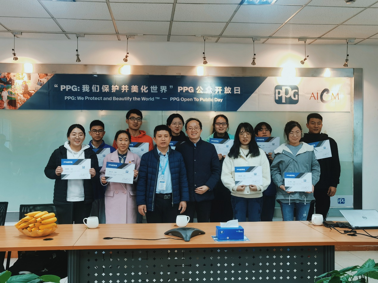 厂长仲基圣先生向在场师生介绍了公司概况,展现了PPG公司百年的雄厚实力及其产品广泛的应用领域,并为此次获奖的10位同学颁发奖学金。PPG管培生计划组成员王延安与大家分享了他在管培生计划中的体验,勉励同学们要保持终身学习的理念,加强自身能力建设。
