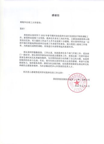 18级本科生邵从容参与国药控股创服医疗技术(上海)有限公司向雷神山物资调配工作,在志愿服务工作中表现突出,收到了来自公司的表扬信。校团委微信公众号将邵从容的事迹推出后,央广网、文汇网、东方网、《上海科技报》等多家媒体均进行转发报道。