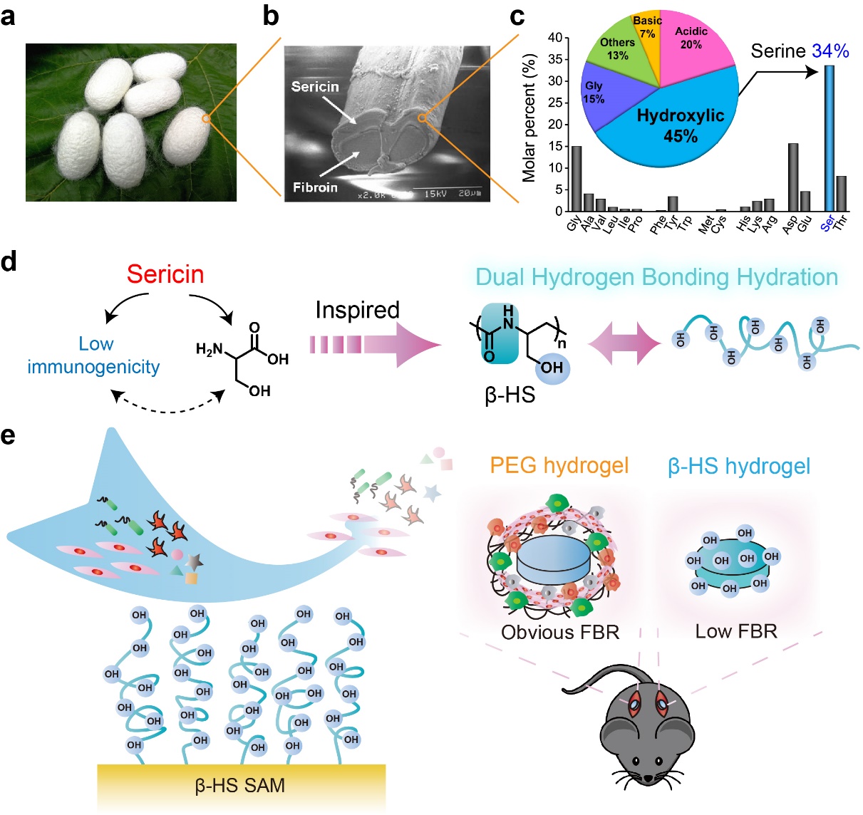 刘润辉教授课题组报道受蚕丝蛋白启发,设计获得了的结构简单、生物相容性好、体内稳定的一类新的抗粘附和抗植入异物反应高分子材料:聚β-丝氨酸。聚β-丝氨酸修饰的表面能够高效抵制多种蛋白吸附、血清污染、细胞、血小板和多种微生物粘附;聚β-丝氨酸水凝胶植入小鼠体内1周到3个月后未发现明显异物反应,明显优于出现显著异物反应的PEG植入对照组。作者首次提出“双重氢键水化”的假设来解释聚β-丝氨酸优异的抗粘附和抗植入异物反应性能,并通过计算模拟加以验证。这类新型抗粘附和抗植入异物反应高分子材料有望用于解决临床中普遍存在的植入材料异物反应难题,在植入材料和装置、药物递送等多个相关领域有广阔的应用前景。