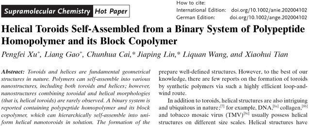博士生徐鹏飞、青年教师高梁在蔡春华教授和林嘉平教授的指导下完成,相关工作以”Helical Toroids Self-Assembled from a Binary System of Polypeptide Homopolymer and Its Block Copolymer”为题发表在Angew. Chem. Int. Ed. (DOI: 10.1002/anie.202004102),并已入选Hot Paper。
