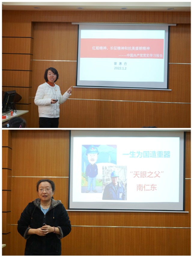 两名党员教师作为党史讲述人,为材二代们阐述了长征精神、抗美援朝精神以及“天眼之父”南仁东的事迹。通过一个又一个感人至深的红色故事,介绍了一代代共产党人及科技工作者不畏艰险、坚守初心、不懈奋斗的拼搏故事,引导青少年感悟党为中国人民谋幸福、为中华民族谋复兴的初心和使命,学习和传承共产党人的精神谱系。