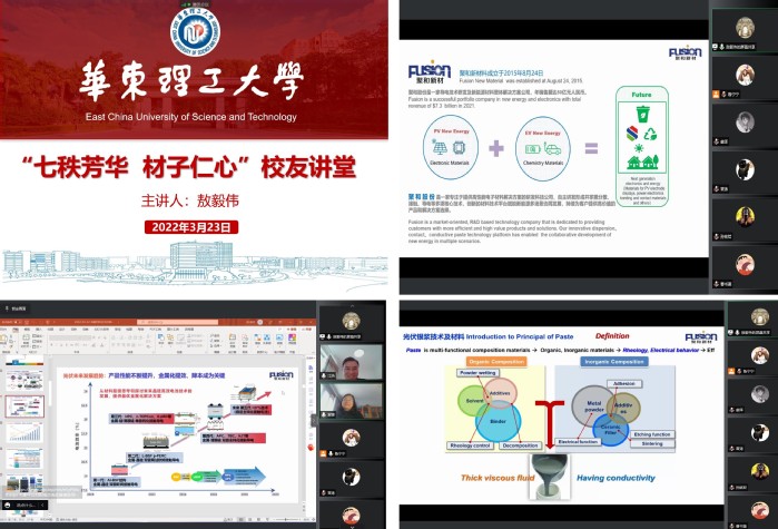 开展“七秩芳华 材子仁心”校友讲堂,凝聚校友力量,同心战“疫”。3月23日下午,常州聚和新材料股份有限公司(以下简称“聚和股份”)董事、研发副总敖毅伟受邀作《功能材料在光伏新能源及电子行业的应用》线上主题报告。本次活动有260余名师生线上积极参加,活动由少妇白洁