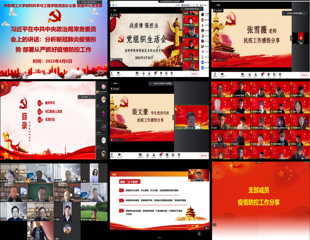 为充分发挥基层党组织力量,学院党委认真组织各党支部召开疫情防控专题组织生活会。学院领导班子成员和党务工作者,根据与师生党支部对接全覆盖的实施方案,深入支部一线,引导师生深入学习上海市疫情防控政策、学校防疫相关文件精神和具体措施,认清疫情防控形势,同时倾听师生心声和需求。教师党支部结合“助力清单”集思广益,助力疫情防控,分享先进事迹、汇聚温暖力量。学生党支部围绕严守疫情防控红线、做校园守护者、珍惜志愿劳动成果、志愿经验分享、阳光心态等开展讨论。师生党员在活动中进一步明晰党支部和党员的责任和义务,弘扬正能量。
