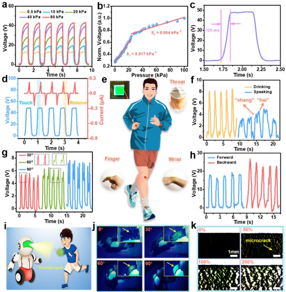 袁双龙课题组创新性提出一种非常简便的水蒸发结晶策略来制备CsPbBr3@KBr固体添加剂,其具有狭窄的半高峰宽、高量子产率以及优异的光照射和热稳定性。在高效发光实现实时显示的同时提高了TENG输出效率,将其与PVA结合作为TENG正极摩擦材料时,其输出性能提高了2.3倍,基于此构建了响应时间为125 ms和响应范围为0-100 kPa的可穿戴传感器用作人体实时运动监测,扩展了钙钛矿基材料的应用领域,并显示了其在自供电的可穿戴传感器领域的巨大前景。