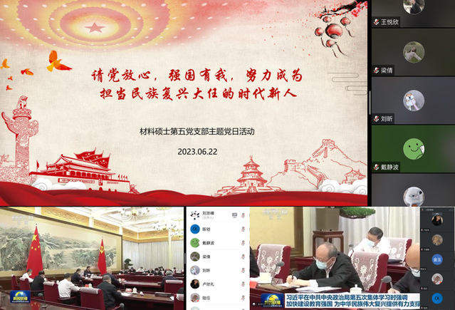 为深入学习贯彻习近平总书记在中央政治局第五次集体学习时的重要讲话精神,622日,材料硕士第五党支部开展了“坚定不移听党话、跟党走,努力成长为堪当民族复兴重任的时代新人”主题党日活动,活动由党支部书记刘浙峰主持。