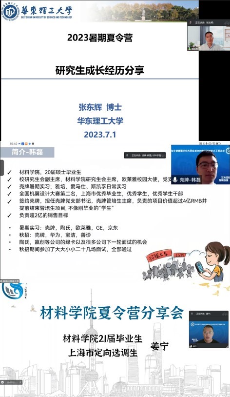 研究生会主席姜宁结合自身在华理工作和学习经历,与营员们分享了导师选择、科研攻克、实习就业等方面的心得与体会,加深了营员们对攻读少妇白洁