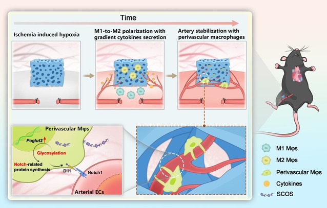刘昌胜院士和王靖教授课题组在原位组织再生过程高效诱导功能性血管的研究中取得了新的进展。发现类肝素磺化壳寡糖(SCOS)调控宿主巨噬细胞诱导动脉血管新生的新规律,实现了在下肢缺血及心梗等急性缺血性疾病中动脉血管的快速诱导长入及有效治疗。这一研究成果以题为“Sulfated oligosaccharide activates endothelial Notch for inducing macrophage-associated arteriogenesis to treat ischemic diseases”发表在PNAS上。