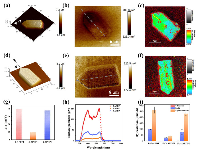研究团队在前期钙钛矿材料结晶行为和结构调控的基础上,创新性地引入具有不同取代位的芳香二胺配体,设计合成了一系列同构的新型二维芳香Dion-Jacobson型钙钛矿光催化材料,即(2-(2-氨基乙基)吡啶)PbI4(2-APDPI),(3-(2-氨基乙基)吡啶)PbI4(3-APDPI),和(4-(2-氨基乙基)吡啶)PbI4(4-APDPI)。其中2-APDPI和4-APDPI结晶于极性空间群,压电常数(d33)约为40 pm V−1,而3-APDPI则结晶于中心对称空间群。