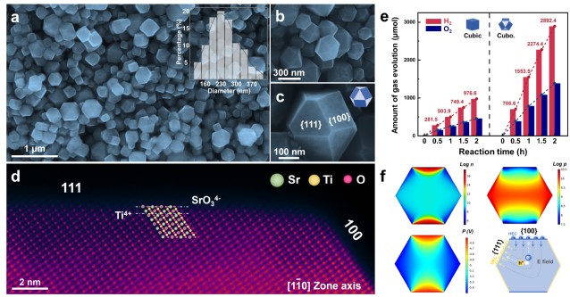 针对上述问题,研究团队创新性地发展了一种固相合成晶面调控策略,通过固态前驱体再结晶过程,可控制备暴露高活性{111}晶面的SrTiO3单晶光催化剂。预合成的低结晶度SrTiO3前驱体为固态再结晶的结构转变过程提供了良好的动力学环境;微量Al3+掺杂离子作为表面形貌调节剂,可以精确调控晶体的表面取向为可控百分比的{111}晶面。光激发电子-空穴对在{100}和{111}面之间实现了高效的各向异性分离,光解水制氢活性随着{111}晶面暴露比例的增加而提高。由于优异的结晶度、低缺陷密度和各向异性表面等结构优势,具有36.6%{111}晶面的SrTiO3单晶光催化剂以2:1的化学计量比实现了高效的光催化分解纯水,析氢速率达到1.55 mmol·h−1。上述提出的晶面调控策略为研制具有明确结构、高结晶度单晶材料开辟了新的途径,对于太阳能燃料、太阳能发电和催化等领域的关键材料制备具有重要意义。
