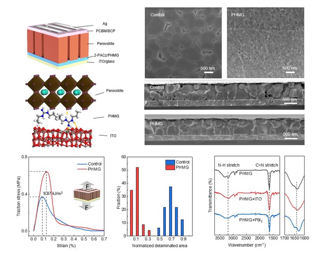 针对上述关键问题,研究团队提出了钙钛矿太阳能电池埋底界面的“机械增强”策略(图1),将具有多电子供体的胍基大分子引入电池埋底界面,其官能团能够与两侧的钙钛矿和氧化铟锡衬底产生强化学偶联作用,从而抑制下界面孔洞缺陷结构的形成。通过聚六亚甲基胍盐酸盐改性后,太阳能电池的光电转化效率显著提高,其中三阳离子钙钛矿电池器件的最高效率可达到23.3%,甲脒铅碘钙钛矿电池器件效率达到25%。此外,通过机械拉伸试验进一步发现下界面的机械断裂强度达到未改性薄膜的两倍,这种界面机械增强作用显著延缓了埋藏界面在光热应力下的形态演变,在标准光照和55 °C的严苛工作条件下,太阳能电池器件持续工作1630小时后仍能保持初始效率的97.5%,达到了国际先进水平。