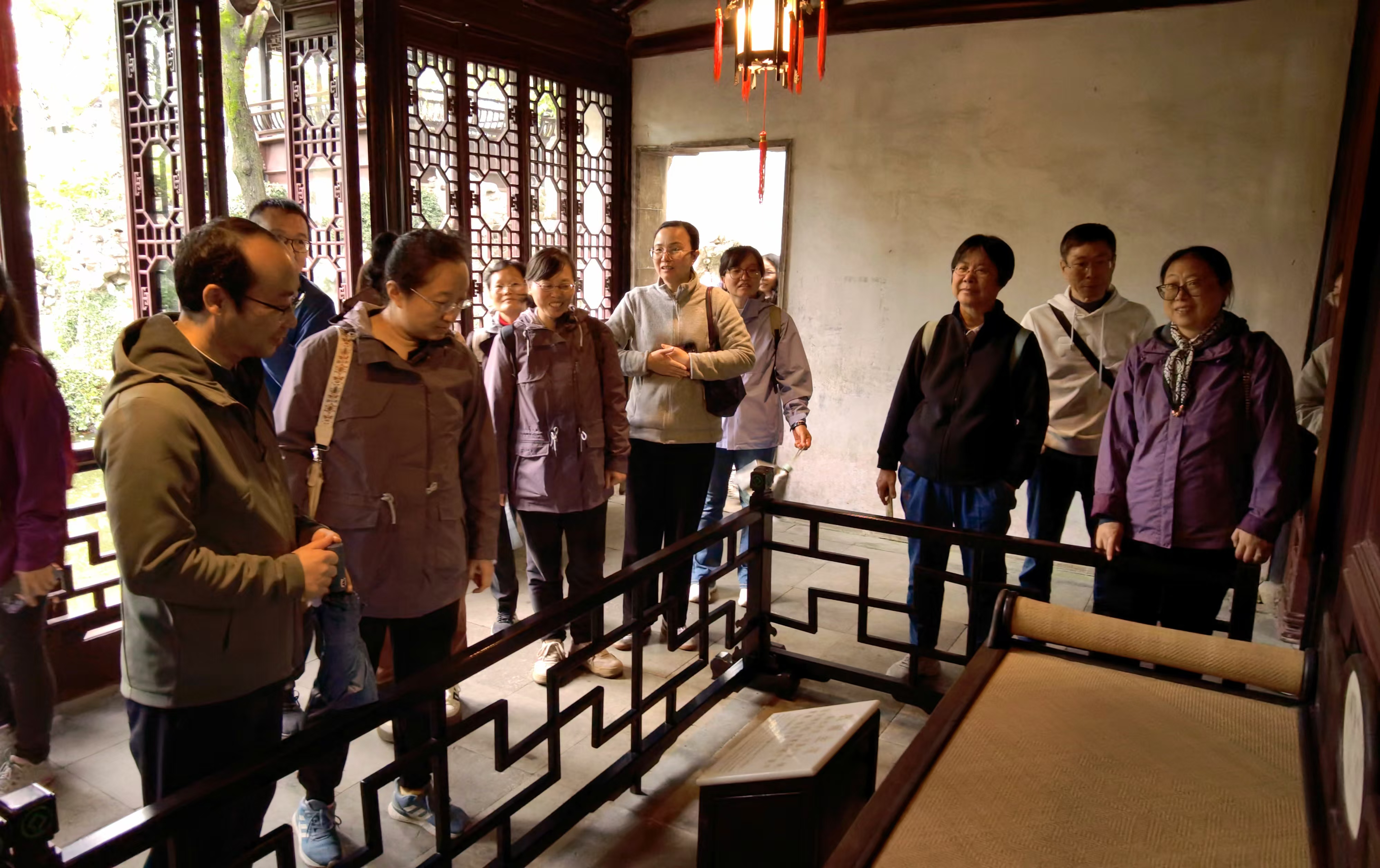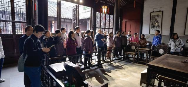 跨过小桥流水,穿过石街古巷,老师们先来到了退思园。这是由光绪年间代理按察使任兰生被罢官返回故里后花费10万两白银建造的一座小巧而精致的私家园林,园名来自《左传》中的“林父之事君也,进思尽忠,退思补过”之意,寓意反思自己的过去,修正错误。老师们穿厅过堂,在导游的讲解中细细品味中国古建筑的巧思和蕴涵的人文情感与礼仪文化,在亭台楼阁、廊桥水榭间徜徉,领悟园林小品、匾额对联和铺地花样中隐喻的人生哲理。