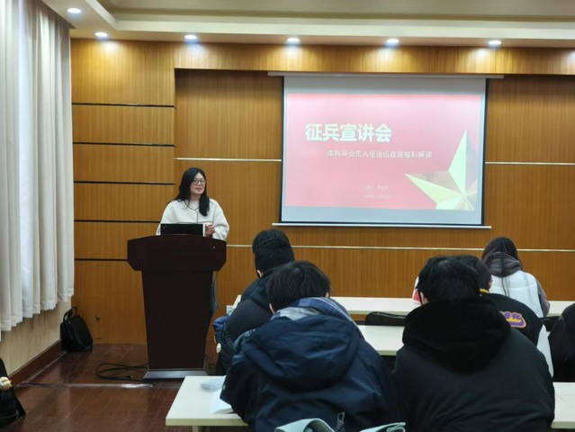 会上,陈新莲为在场2025届本科毕业生普及征兵政策,从入伍条件、报名流程到优惠政策,如退役后升学优待、就业安置扶持等方面进行了全方位、多角度的阐释,并结合实际案例,深入浅出地让同学们了解参军带来的诸多机遇与保障。她提醒大家入伍不仅是一种生涯选择,更是一个以实际行动诠释当代大学生的担当与责任的机会,要时刻牢记历史,胸怀中华民族复兴之志,在托举强国梦强军梦中追寻个人梦想。
