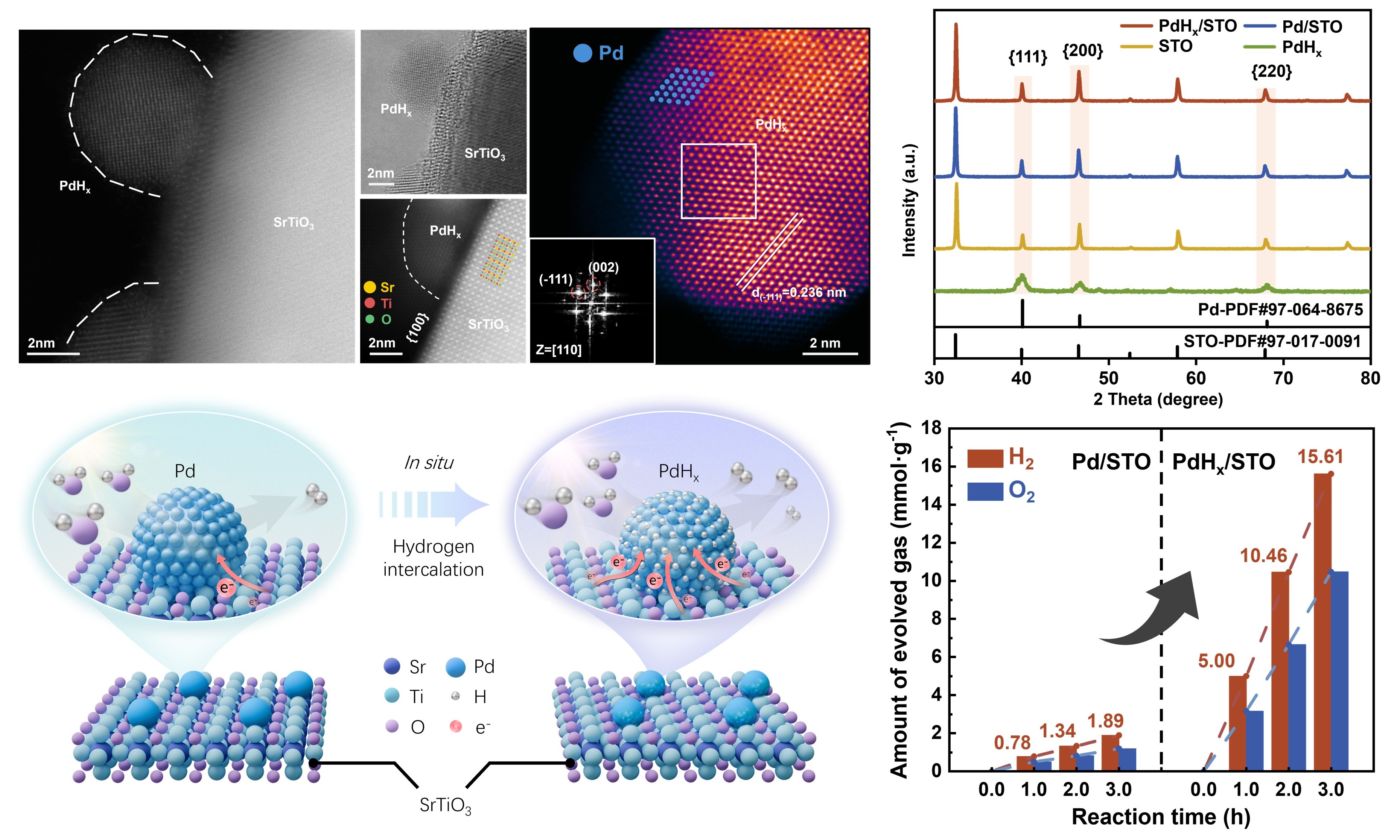 清洁能源材料与器件团队选取钛酸锶(SrTiO3, STO)作为半导体光催化材料,通过在STO表面定向锚定晶格匹配的Pd纳米团簇作为助催化剂,进一步通过原位注氢手段可控构建出PdHx活性结构。PdHx/STO的光催化体系展现出优异的光分解纯水制氢性能,其氢气析出速率高达5 mmol·g-1·h-1,较未注氢前的Pd/STO提升6.4倍。
