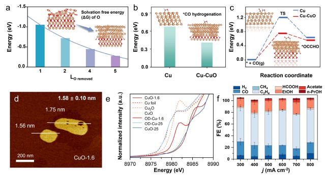 清洁能源材料与器件团队以CuO纳米片为模型材料,探究了厚度对OD-Cu残余氧的影响。当CuO纳米片厚度降至1.6 nm时,氧保留能力显著增强,在300-700 mA cm-2的宽电流密度范围内实现了约80%的C2+产物法拉第效率(FE),并在700 mA cm-2条件下达到84.6%的C2+产物选择性峰值。研究团队通过对CuO纳米片材料进行系统的结构研究,阐明了纳米片厚度对调控OD-Cu残留氧的关键作用:分子动力学模拟表明,随着氧脱除层数增加,工况还原过程中Cu-CuO结构的底层氧原子难以向外部扩散,这种特性有效促进了*CHO中间体形成以及后续的*OC-CHO偶联反应,进而提升了C2+产物选择性;结合结构表征、电化学分析以及相关原位表征结果,发现重构堆叠的Cu-CuO纳米片结构具有强氧保留能力和易再氧化的金属铜位点,这种协同效应优化了OH-吸附和*CO富集,显著促进了C2+产物生成。该研究工作不仅为设计高效OD-Cu催化剂以实现CO2电还原制取多碳产物提供了重要理论依据,同时揭示了氧保留效应在CO2电还原反应过程对催化性能的影响机制。