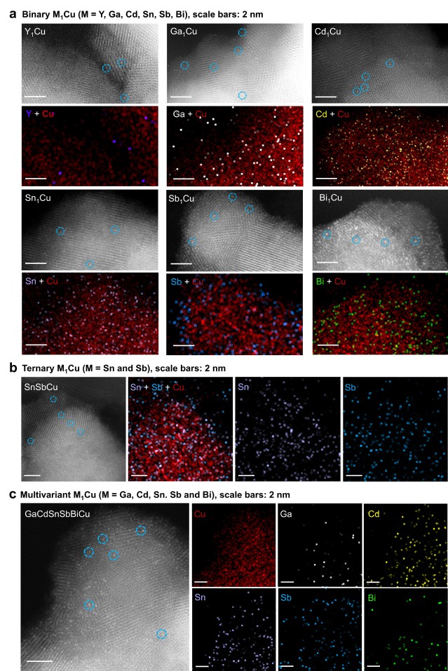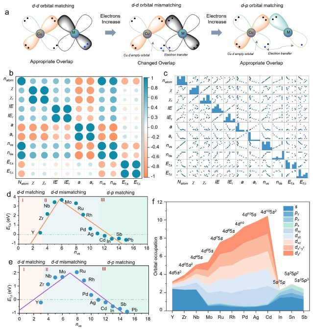 清洁能源材料与器件团队结合理论计算与实验验证,建立了一种简单直观的d-p轨道匹配机制,用于快速评估Cu基SAA的结构稳定性。研究表明,相较于d轨道部分占据的金属元素,具有d1电子构型或完全填充内层d轨道但外层s和p轨道部分占据的金属元素,在Cu基底上具有更好的分散稳定性。在此基础上,通过实验验证可控制备出8种工况结构稳定的单原子合金材料体系,证明了该机制在二元、三元及多元SAA合成中具有广泛适用性。