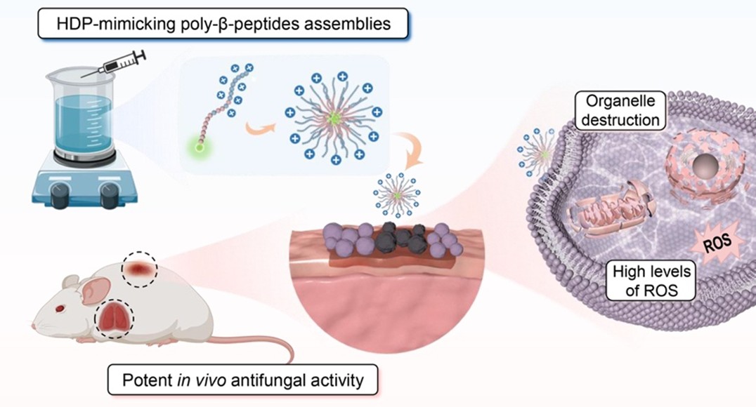 刘润辉教授课题组报道了一种对耐药真菌具有体内外高效抗菌活性的聚-β-多肽组装体。该研究成果以“Self-assembled poly(sarcosine) functionalized host defense peptide-mimicking poly-β-peptides for combating drug-resistant fungal infection”(用于抗耐药性真菌感染的自组装聚肌氨酸功能化宿主防御肽模拟聚-β-多肽)为题发表在国际权威学术期刊《先进功能材料》(Adv. Funct. Mater.2025, DOI:10.1002/adfm.202424125)上。