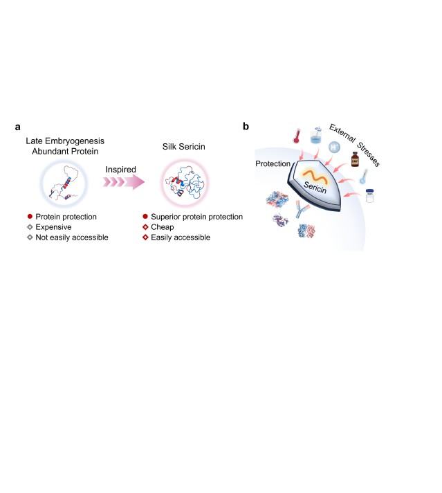 受晚期胚胎发生丰富(LEA)蛋白这一类具有高亲水性且无明确结构的特殊分子伴侣的启发,作者聚焦于来源于蚕丝外层的天然蛋白——丝胶蛋白,一种具有高度亲水性和高无规卷曲含量的天然蛋白质。作者研究发现丝胶蛋白具有类似分子伴侣的活性,在各种环境胁迫下(包括高温、机械力、酸性条件、存在有机溶剂、冷冻干燥及反复冻融等)有效稳定具有不同理化性质的蛋白质,这是常用的单一保护剂所难以实现的。机制研究表明,丝胶蛋白通过与蛋白质相互作用形成屏障来保护蛋白质免受环境胁迫。值得一提的是,作为丝绸工业的副产物,丝胶蛋白不仅容易获取、价格低廉,更具有优异的生物相容性,这使其在蛋白质药物保存、生物制剂开发和工业酶应用等领域展现出独特的应用价值和广阔的应用前景。