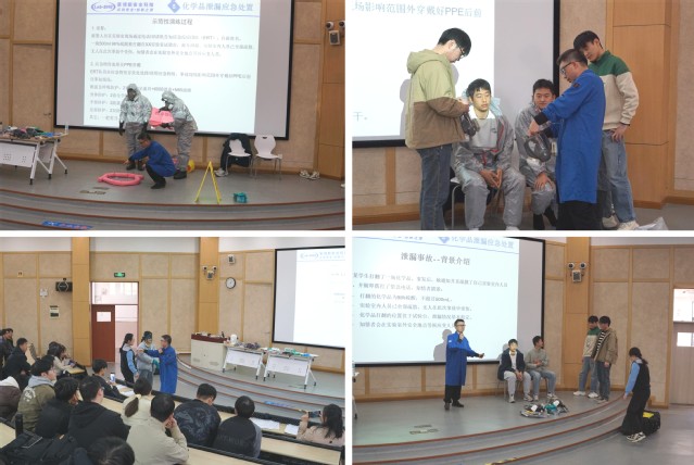 培训以“防护知识+实操演练”形式展开。理论环节,马宝意结合真实事故案例与实物演示,系统讲解呼吸、眼面部、手部、身体防护用品的功能差异、选配要点及正确使用方法,强调“无万能防护装备”原则;同时覆盖危险化学品分类、应急救援物资、喷淋及洗眼器规范使用等核心安全知识。化学品泄漏应急处置部分,马宝意介绍吸附棉、中和剂等应急物资的使用要点,明确“自身安全优先”的处置准则,并以硫酸泄漏为模拟场景开展示范性演练——指导师生正确穿戴化学防护服、全面具、防护靴、手套等防护装备,依次完成泄漏区域安全评估、吸附清理及废弃物处理的全流程操作。