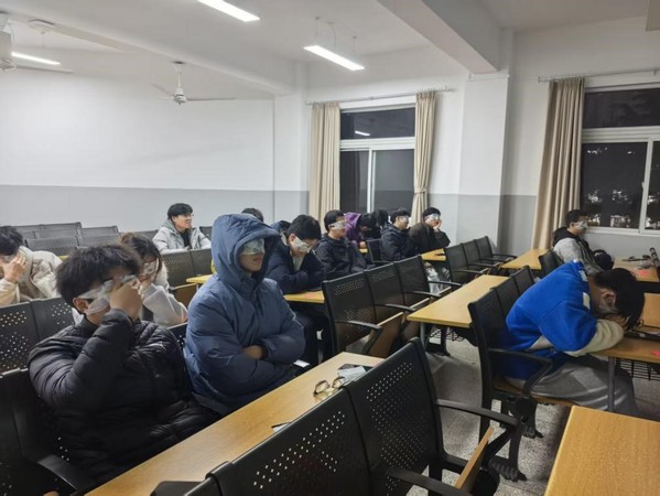 同学们伴着轻柔音乐安静入场,领取物资,班长说明活动初衷与规则。核心的沉浸体验环节,现场灯光被缓缓调暗,仅保留微弱安全照明,同学们佩戴好眼罩,调整至最舒适的坐姿,伴随着舒缓的专业音频,开启沉浸式心理放松之旅。专业的引导语搭配柔和的背景音乐,让大家暂时抛开生活和工作焦虑,全身心沉浸其中,在静谧中与自我对话,实现身心的深度舒缓。